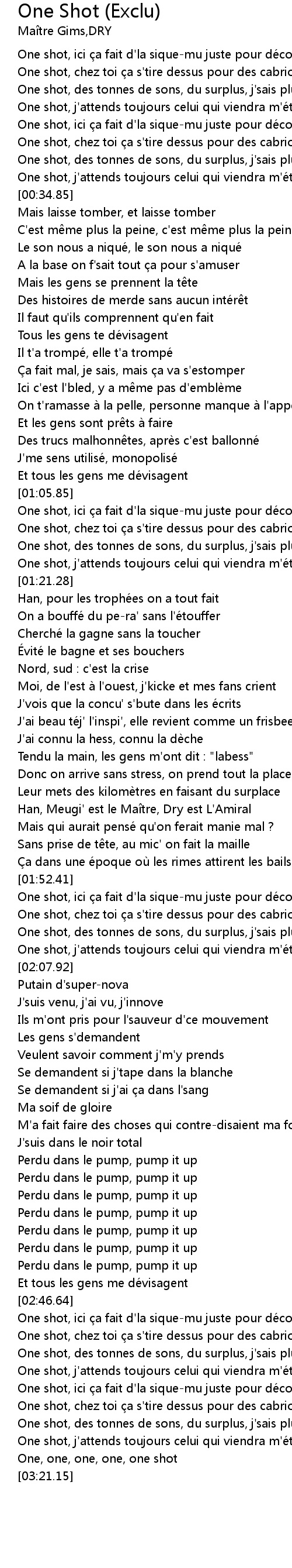 | [00:08.14] | One shot, chez toi a s' tire dessus pour des cabriolets |
