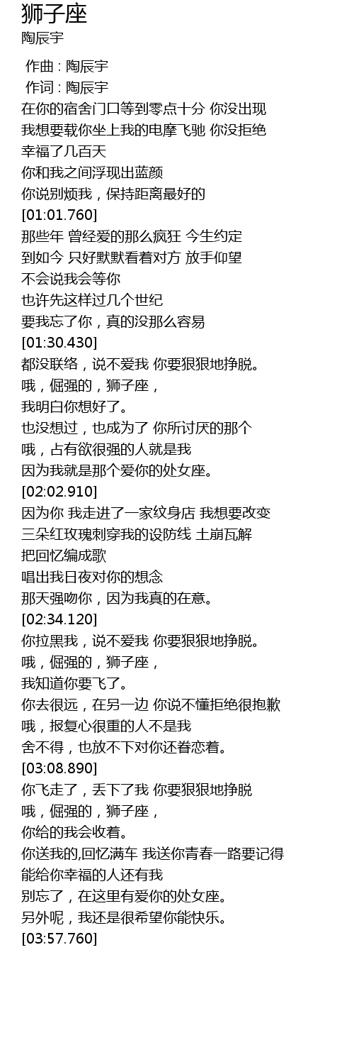 | [01:38.750] | 哦,倔强的,狮子座, |