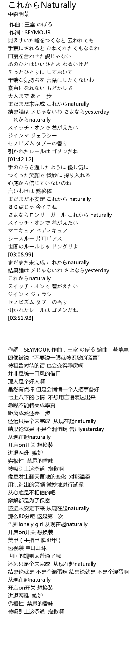 | [01:07.34] | まだまだ未完成 これからnaturally |