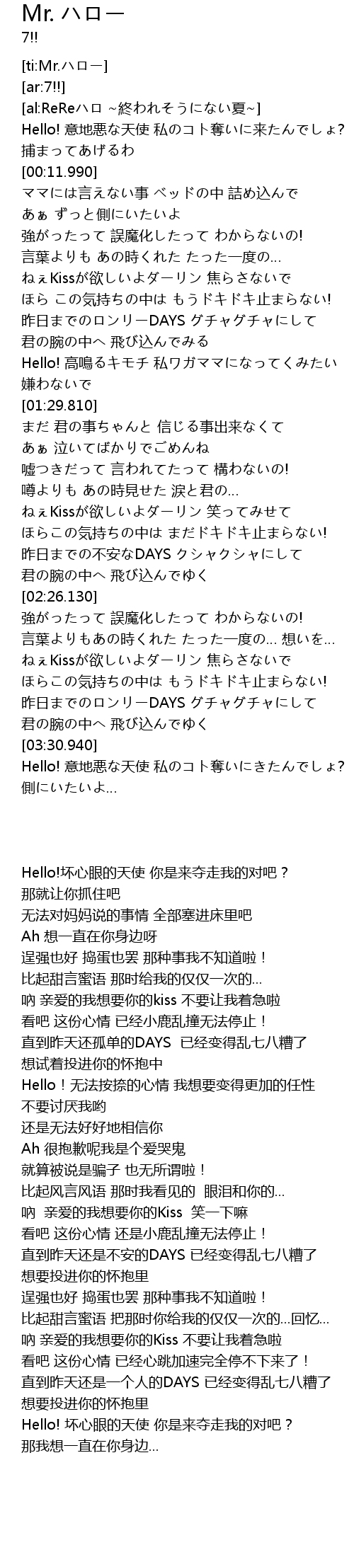 | [03:34.070] | Hello! 意地悪な天使 私のコト奪いにきたんでしょ? |