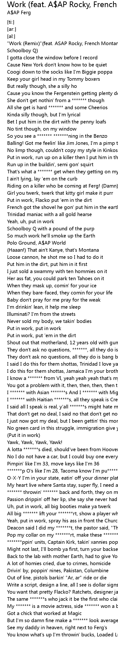 | [00:00.00] | "Work (Remix)"(feat. ASAP Rocky, French Montana, Trinidad James & Schoolboy Q) |