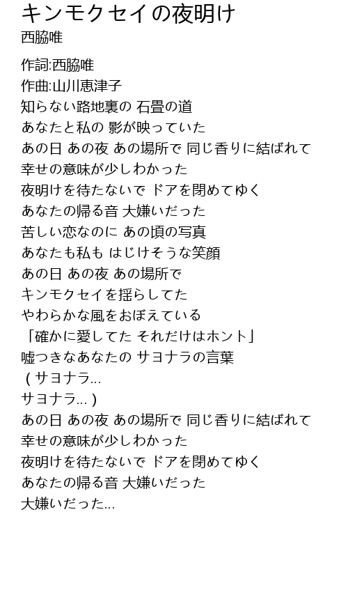 | [01:21.50] | あの日 あの夜 あの場所で キンモクセイを揺らしてた |
