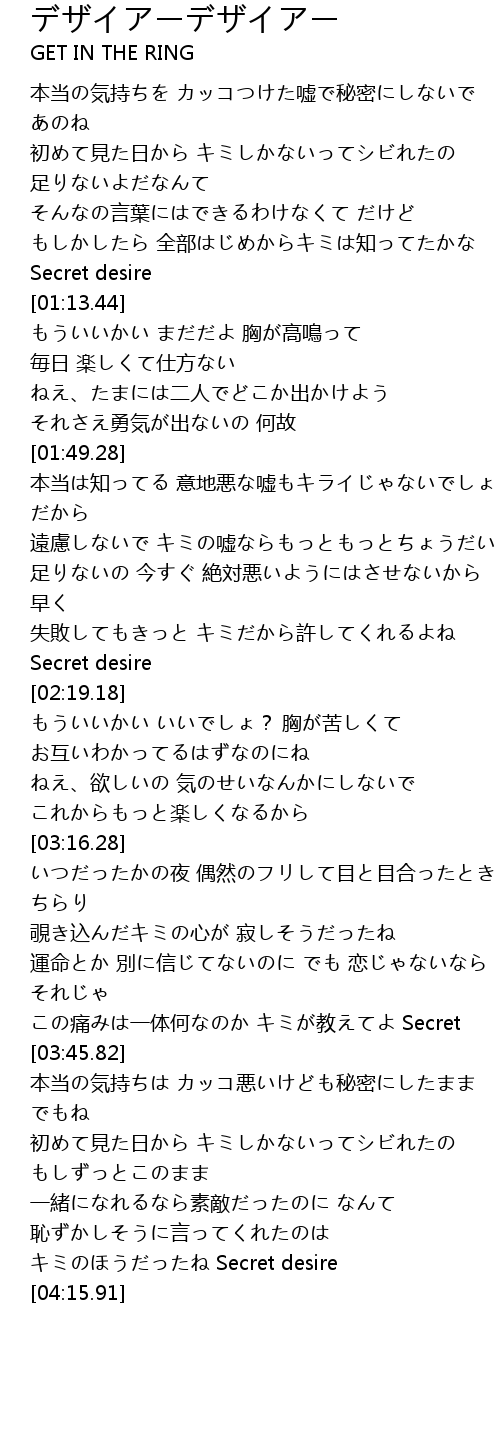 | [02:11.51] | 失敗してもきっと キミだから許してくれるよね Secret desire |