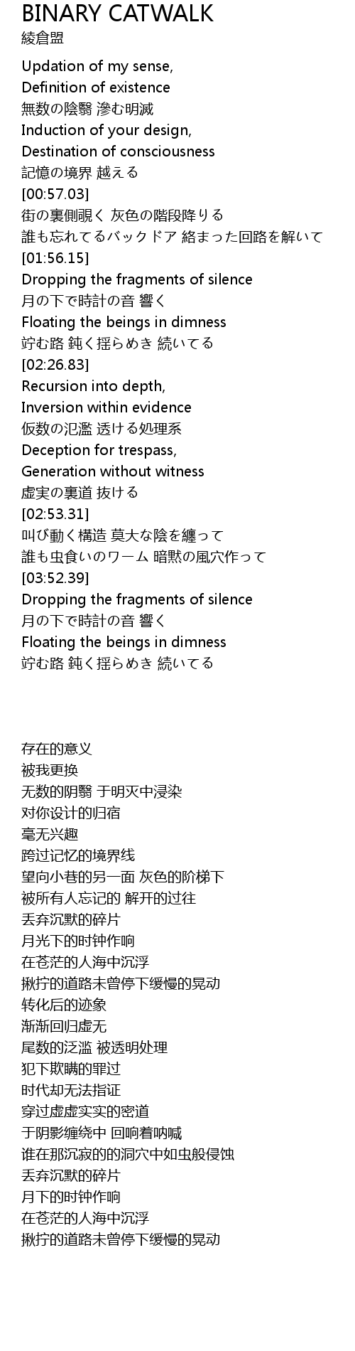 | [01:57.06] | Dropping the fragments of silence |