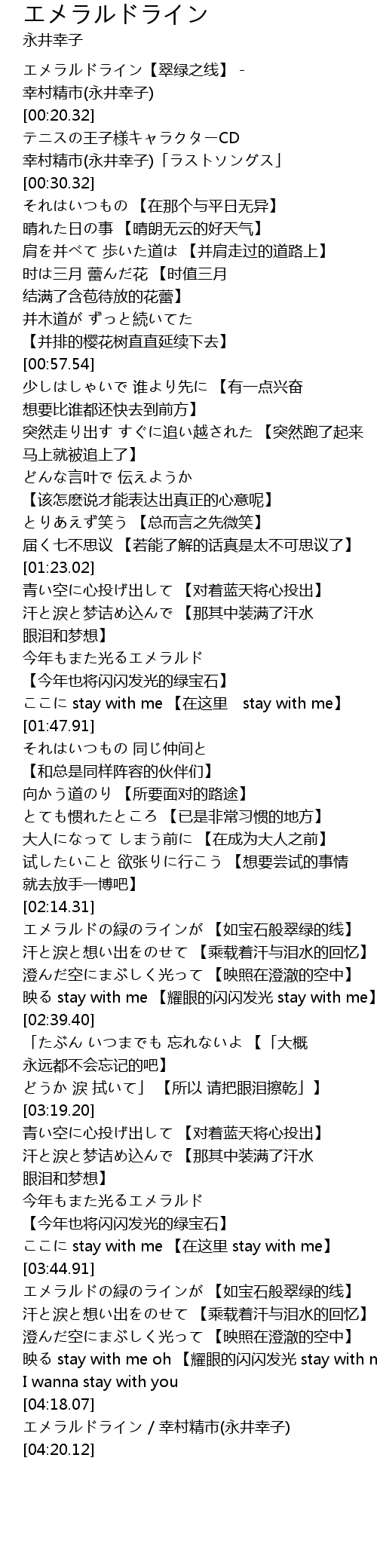 | [00:00.34] | エメラルドライン【翠绿之线】 - 幸村精市(永井幸子) |