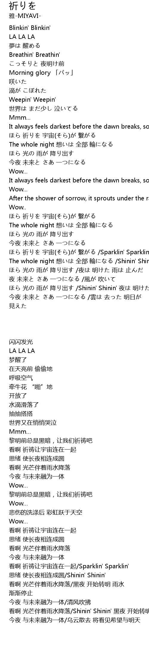 | [05:14.78] | ほら 光の 雨が 降り出す /Shinin' Shinin' 夜は 明けた |