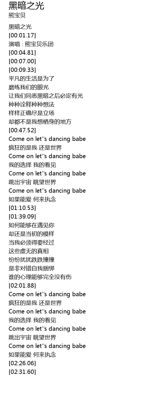 | [00:02.96] | 演唱∶熊宝贝乐团 |