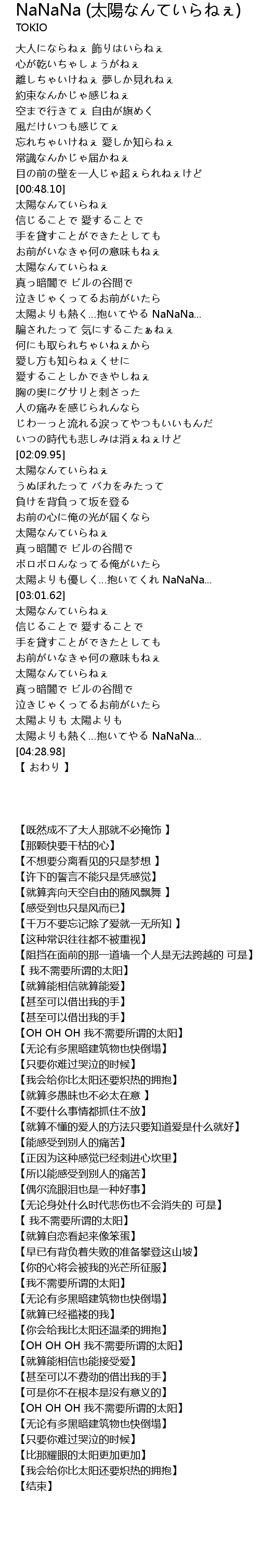 | [02:41.84] | 太陽よりも優しく…抱いてくれ NaNaNa... |