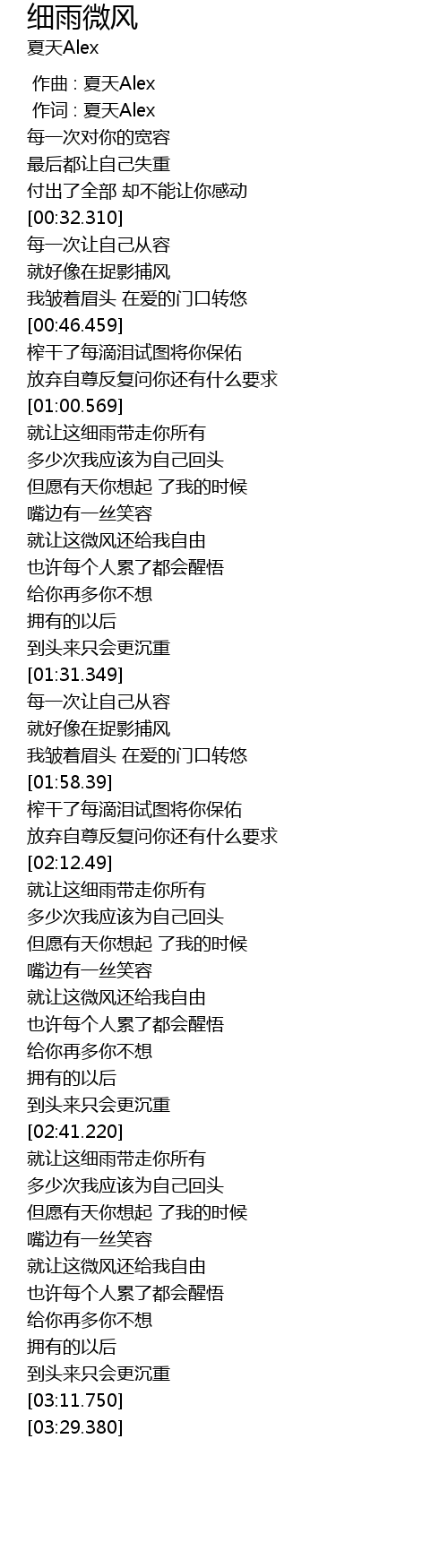 | [00:01.00] | 作词 : 夏天Alex |