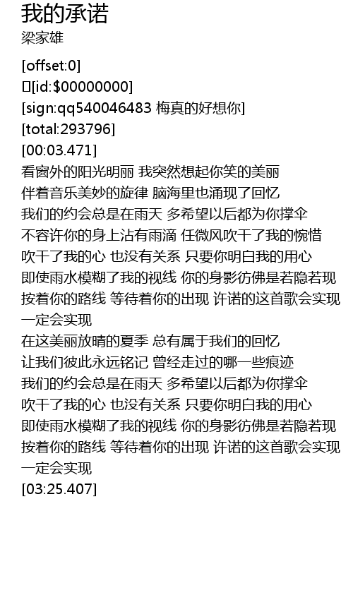 | [01:36.623] | 按着你的路线 等待着你的出现 许诺的这首歌会实现 一定会实现 |