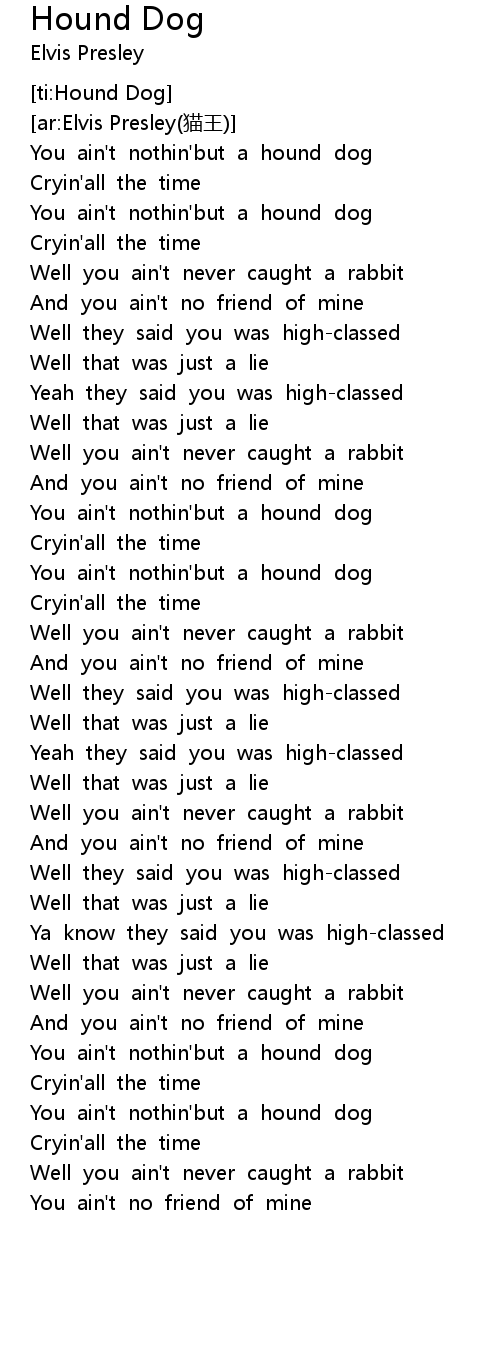 | [00:05.369] | You ain' t nothin' but a hound dog |
