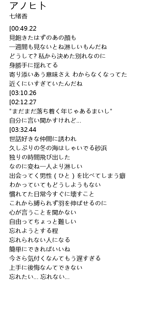 | [01:01.94][03:10.26] | アノヒト… 全ての記憶を消し去ること |