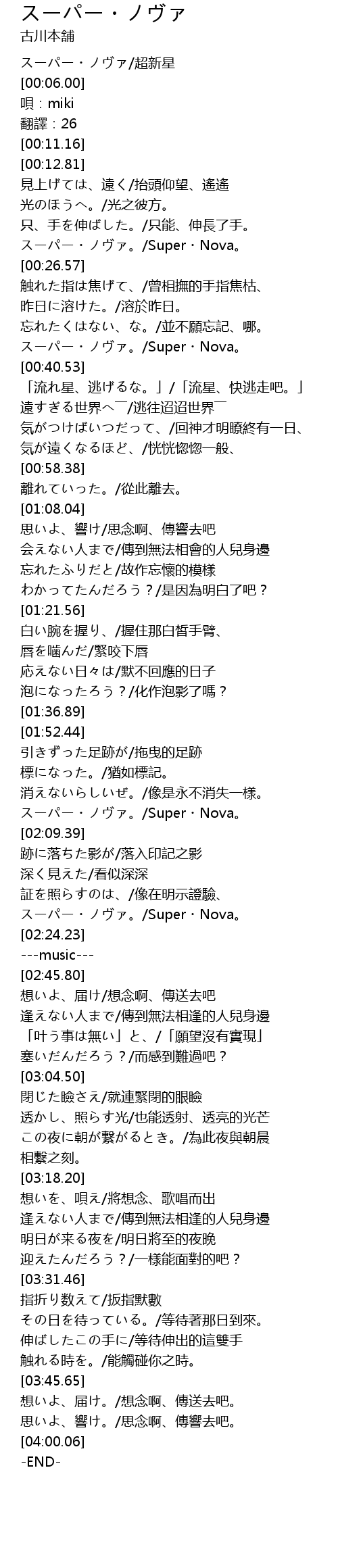 | [00:24.16] | スーパー・ノヴァ。/Super・Nova。 |