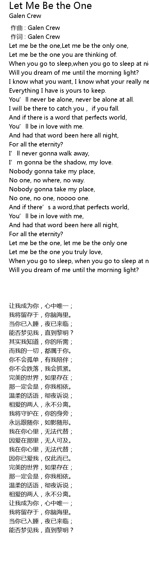 | [00:05.50] | Let me be the one, Let me be the only one, |