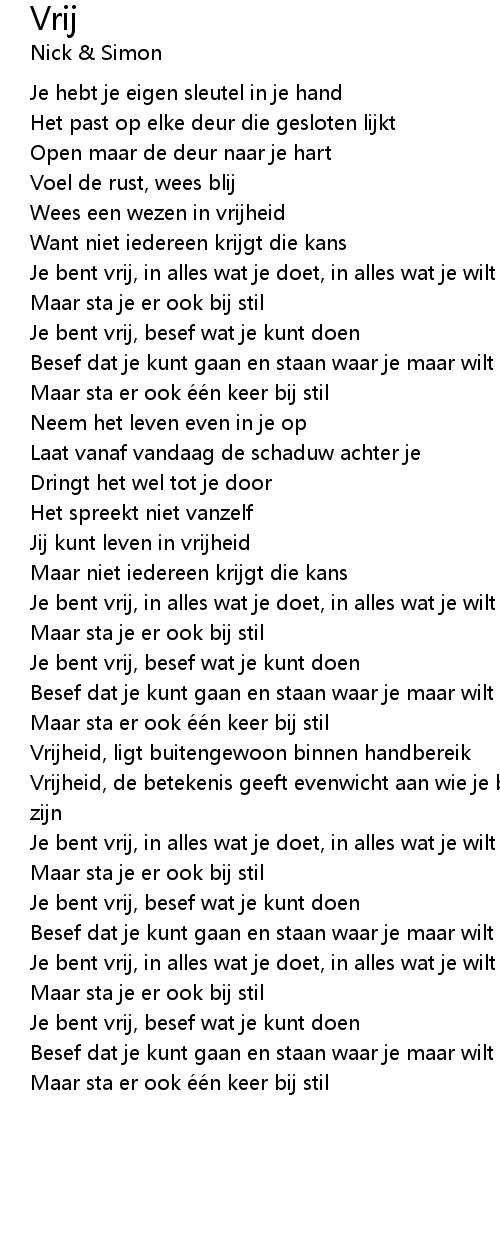 | [02:59.00] | Je bent vrij, in alles wat je doet, in alles wat je wilt |