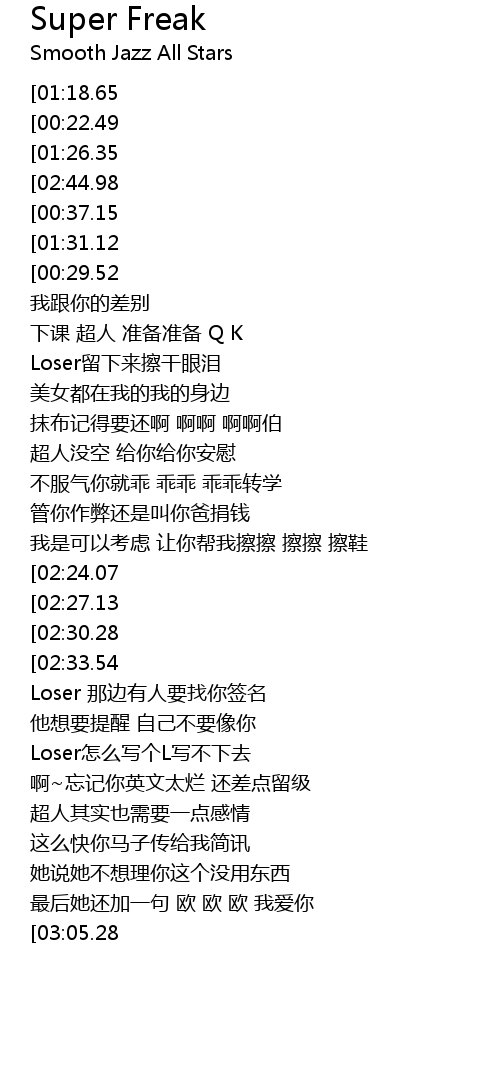 | [02:43.24][02:44.98][02:46.60][02:56.66][02:58.16][02:59.60] | year~我是superman |