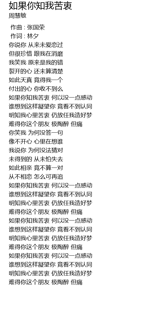 | [03:34.590] | rú guǒ nǐ zhī wǒ kǔ zhōng hé yǐ méi yì diǎn gǎn dòng |