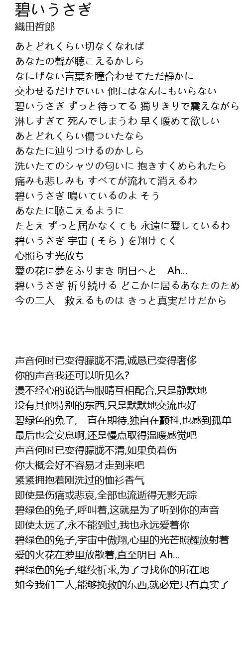 | [03:23.85] | 碧いうさぎ 祈り続ける どこかに居るあなたのため |