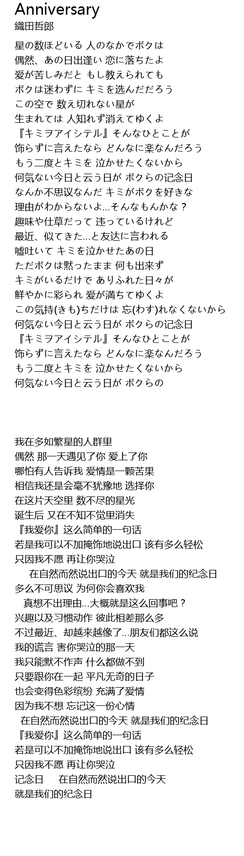 | [03:53.64] | 何気ない今日と云う日が ボクらの记念日 |