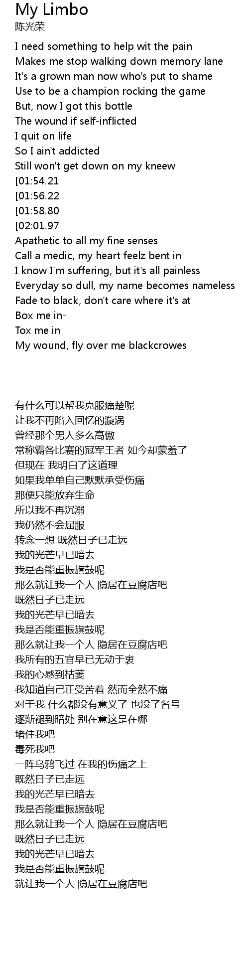 | [02:13.09][02:01.97][01:09.46][00:58.21] | Leave me here in my limbo |