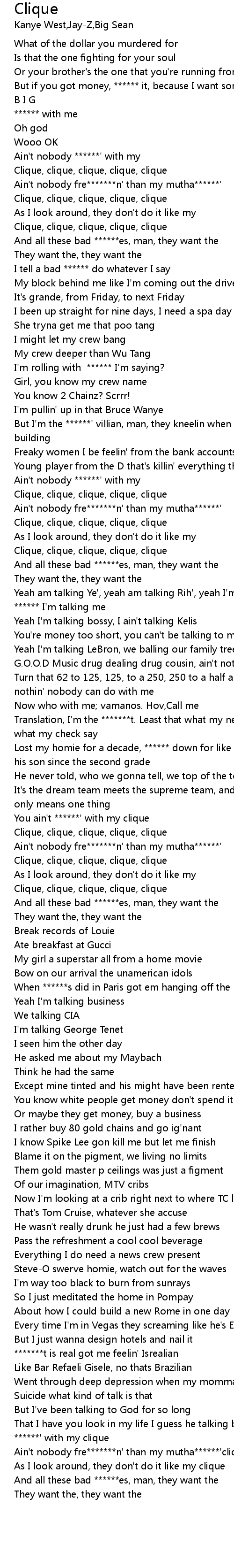 | [04:33.65] | Ain't nobody fre*******n' than my mutha******'clique |