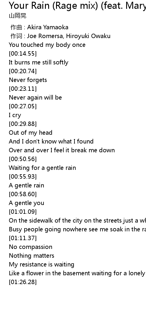 | [01:06.89] | Busy people going nowhere see me soak in the rain |