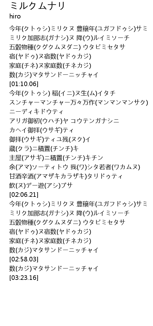 | [02:38.79] | 今年(クトゥシ)ミリクヌ 豊穣年(ユガフドゥシ)サミ |