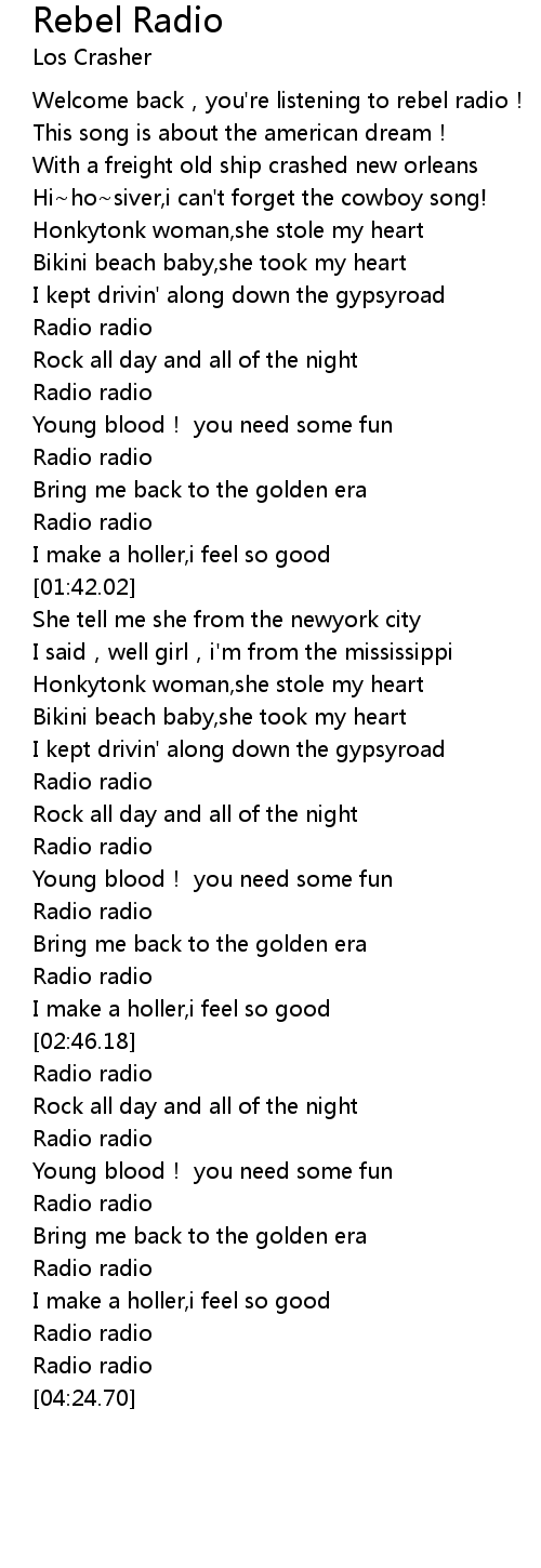 | [00:39.60] | Welcome back, you' re listening to rebel radio! |