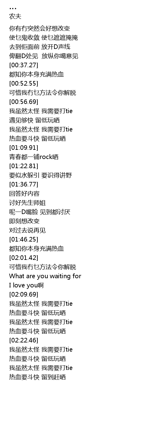 | [02:35.88] | 我虽然太怪 我需要打tie |