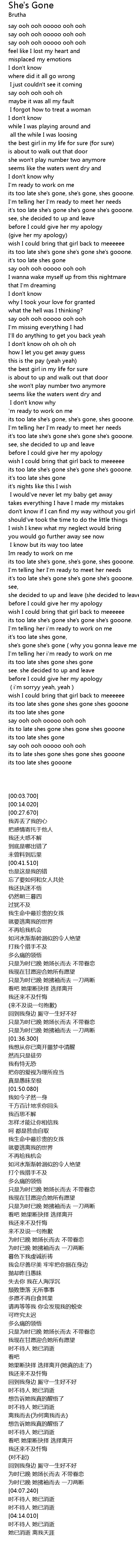 | [03:48.670] | its too late shes gone shes gone |
