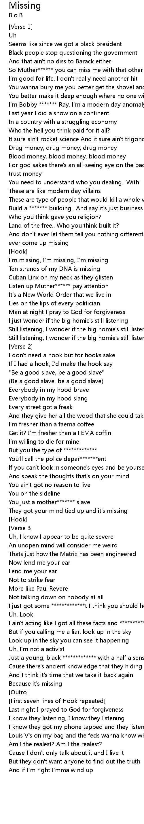 | And don't ever let them tell you nothing different, cuz we know who did it if I ever come up missing | |