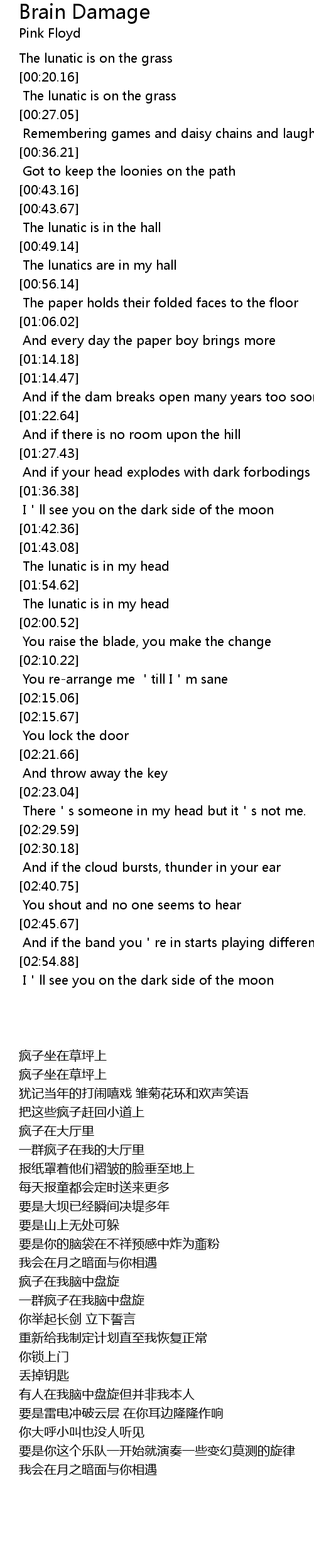 | [00:14.87] | The lunatic is on the grass |