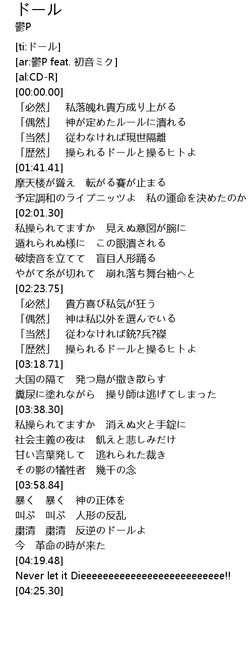 | [04:03.98] | 叫ぶ 叫ぶ 人形の反乱 |
