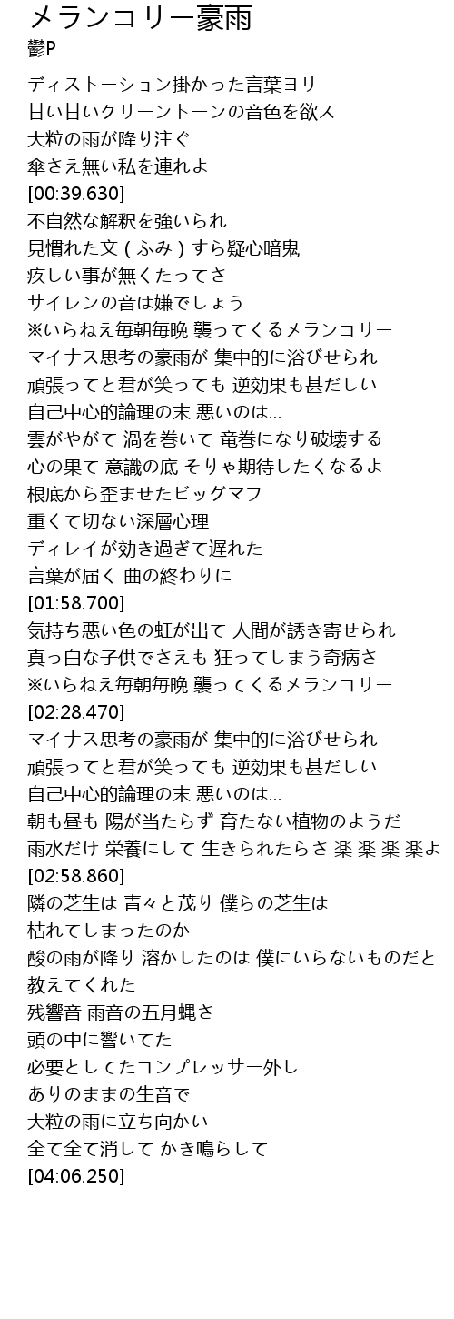 | [03:35.160] | 残響音 雨音の五月蝿さ |