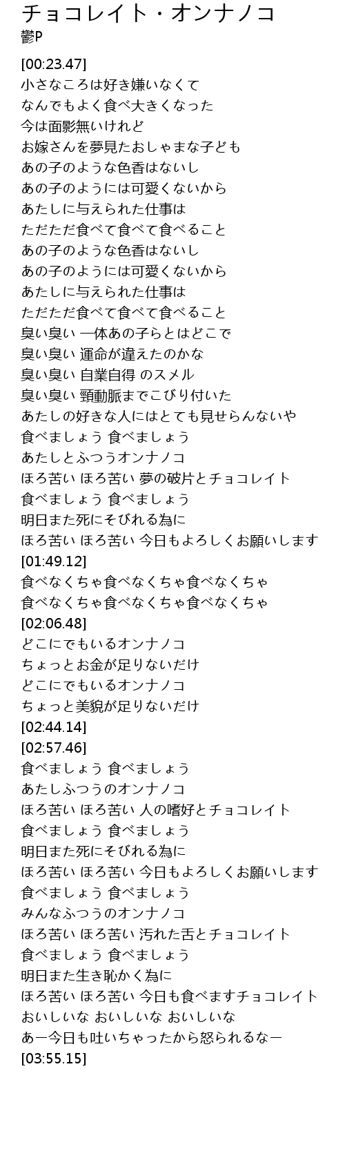 | [03:35.13] | ほろ苦い ほろ苦い 今日も食べますチョコレイト |