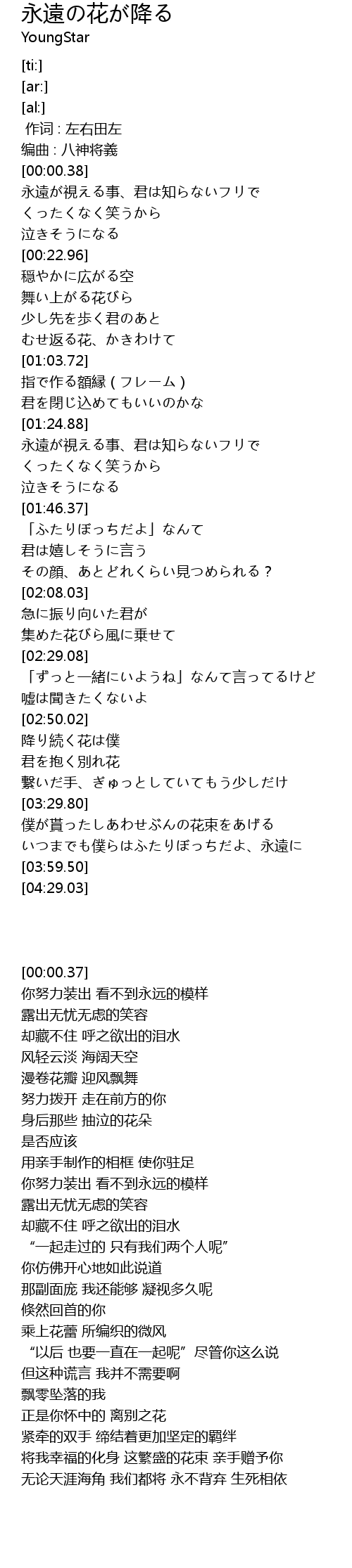 | [03:40.47] | いつまでも僕らはふたりぼっちだよ、永遠に |
