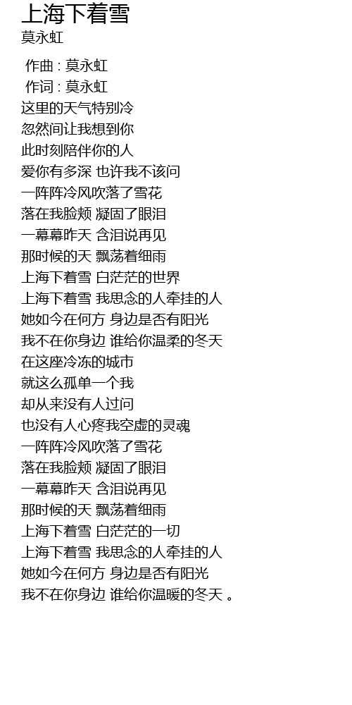 | [04:04.880] | 上海下着雪 我思念的人牵挂的人 |