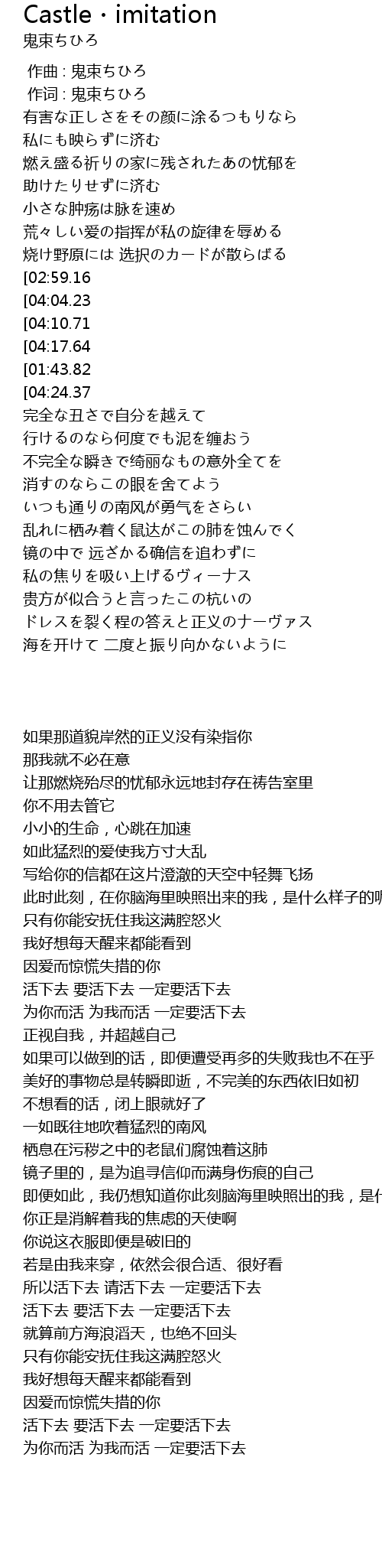 | [01:41.17][01:43.82][03:28.59] | 生きて 生きて 生きて |