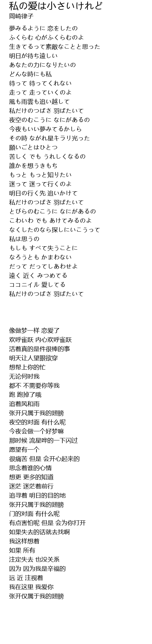 | [02:05.4] | 私だけのつばさ 羽ばたいて |