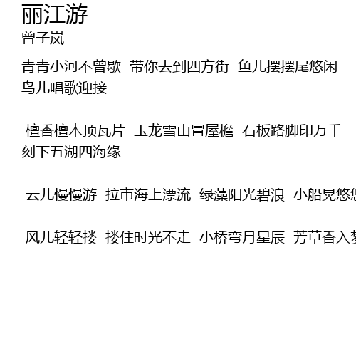 | 檀香檀木顶瓦片 玉龙雪山冒屋檐 石板路脚印万千 刻下五湖四海缘 | |