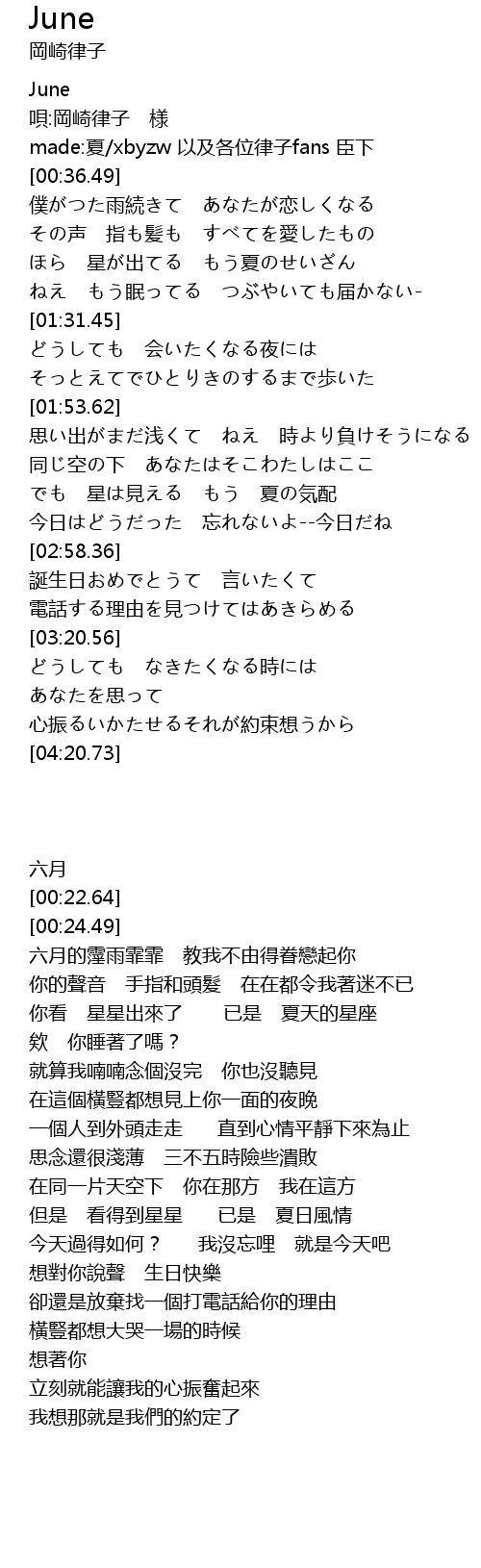 | [00:24.49] | made:夏/xbyzw 以及各位律子fans 臣下 |