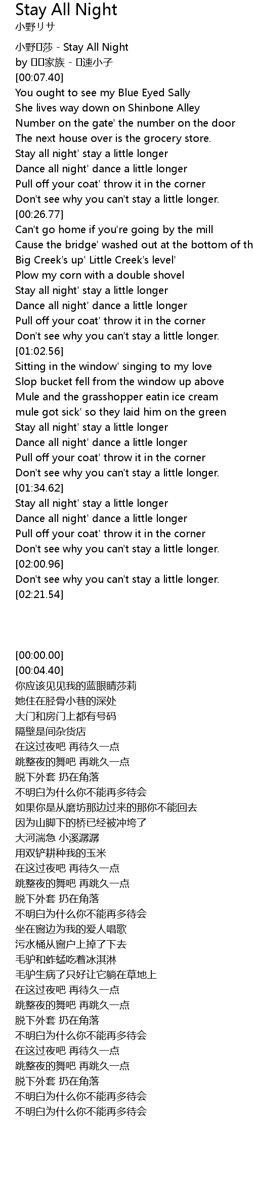 | [00:00.00] | 小野�莎 - Stay All Night |