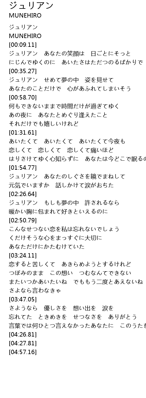 | [00:13.91] | ジュリアン あなたの笑顔は 日ごとにそっと |
