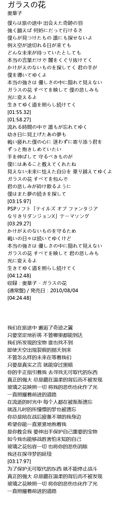 | [04:14.48] | 収録:奥華子 - ガラスの花 (通常盤)/発売日:2010/08/04 |