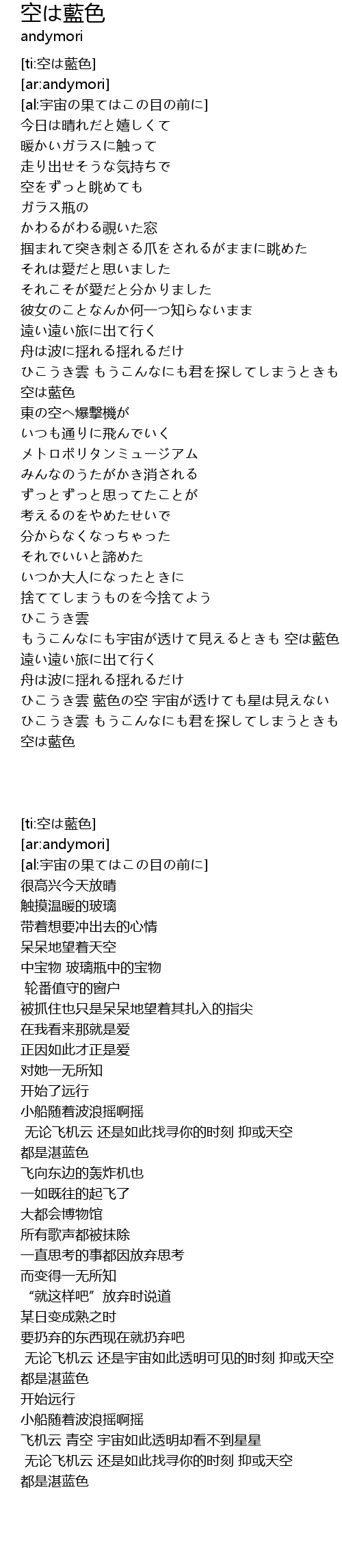 | [03:22.61] | ひこうき雲 もうこんなにも宇宙が透けて見えるときも 空は藍色 |