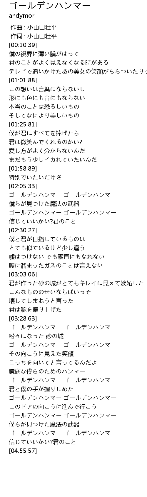 | [02:06.83] | ゴールデンハンマー ゴールデンハンマー 僕らが見つけた魔法の武器 |