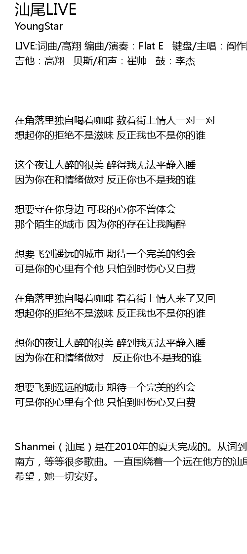 | Shanmei(汕尾)是在2010年的夏天完成的。从词到曲一共用了不到二十分钟的时间。然后和朋友们用很简单的设备录了一个比较粗糙的小样,而这首歌,完全源于一个从未见过的女孩,乃至以后的北方 南方,等等很多歌曲。一直围绕着一个远在他方的汕尾女孩而写,可以说,这四年,从青岛到汕尾,从哭到笑,从高兴到失落,甚至还有病危等意想不到的还有很多很多的故事,彷佛用了四年走完了一生。虽然,我们还是没能在一起,但是,我依然很想她。我是多么希望,还能在演一次汕尾,还能在回味甚至回去从前。。。 | |
