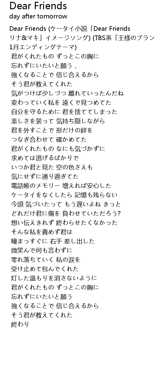 | Dear Friends (ケータイ小説「Dear Friends リナ&マキ」イメージソング) (TBS系「王様のブランチ」12月 1月エンディングテーマ) | |