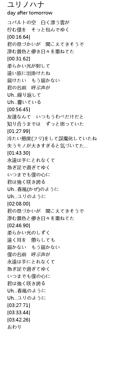 | [02:03.88] | Uh...ユリのように |