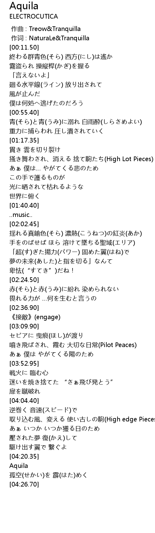| [03:44.85] | 噴き飛ばされ、霞む 大切な日常(Pilot Peaces) |